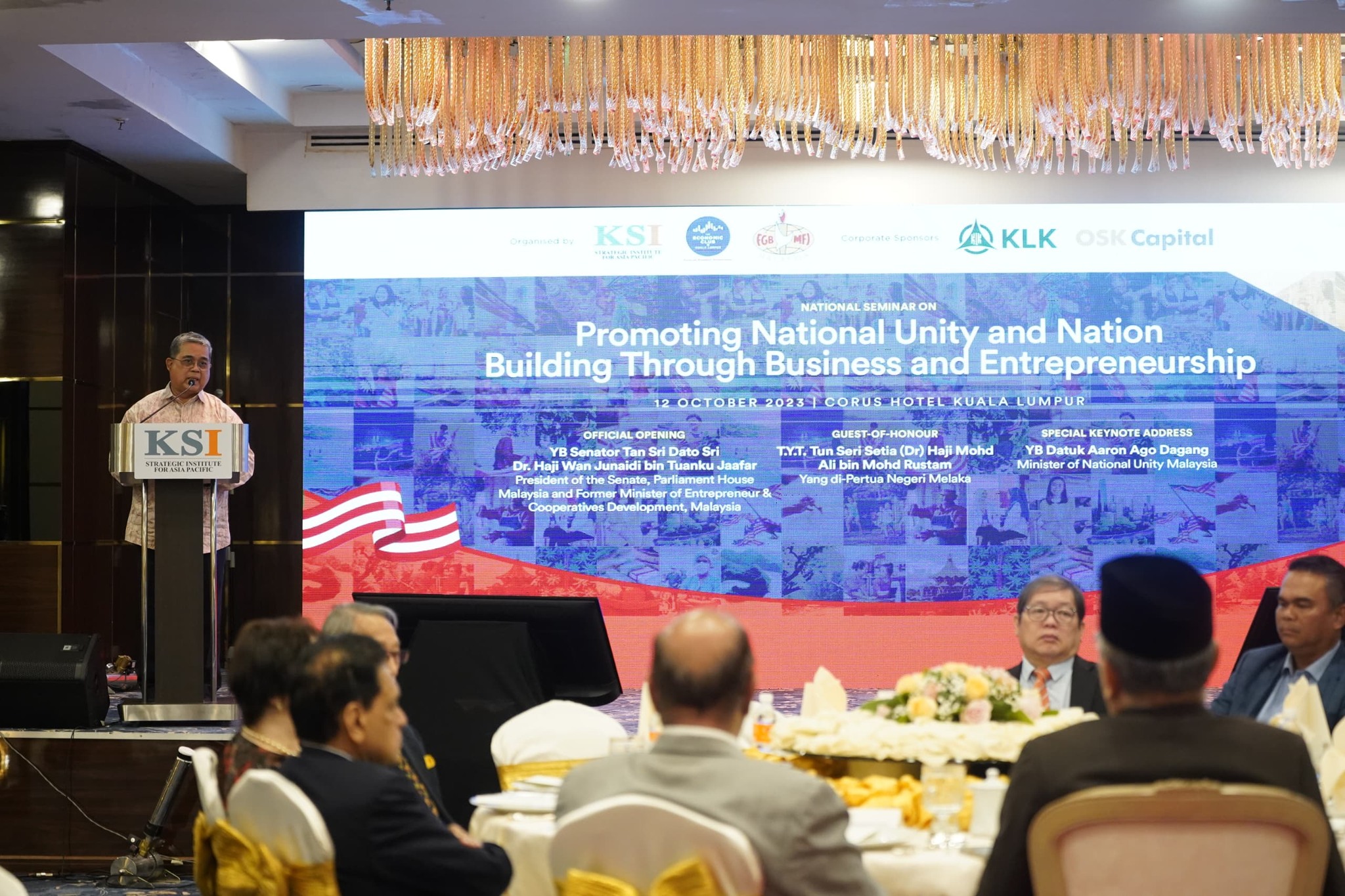 12 Oktober 2023,Kuala Lumpur-YB Datuk Aaron Ago Dagang, Menteri Perpaduan Negara telah hadir menyampaikan ucaptama khas dalam Seminar "Promoting National Unity and Nation Building through Business and Entrepreneurship" yang dianjurkan oleh KSI Strategic Institute for Asia Pacific di Hotel Chorus, Kuala Lumpur.YB Datuk telah menyentuh berhubung peranan sektor korporat dalam menjayakan agenda perpaduan negara. Turut mengupas berkenaan Matlamat Pembangunan Mampan terutamanya Matlamat ke-17 iaitu “Kerjasama demi Matlamat” yang harus dilaksanakan oleh sektor korporat melalui kerjasama strategik bersama agensi kerajaan.Kementerian Perpaduan Negara amat mengalu-alukan sokongan dan kerjasama strategik bagi menjayakan inisiatif seperti Kebuniti Madani, Biasiswa Tunku Abdul Rahman, Tuisyen KAMI dan RT Cares.