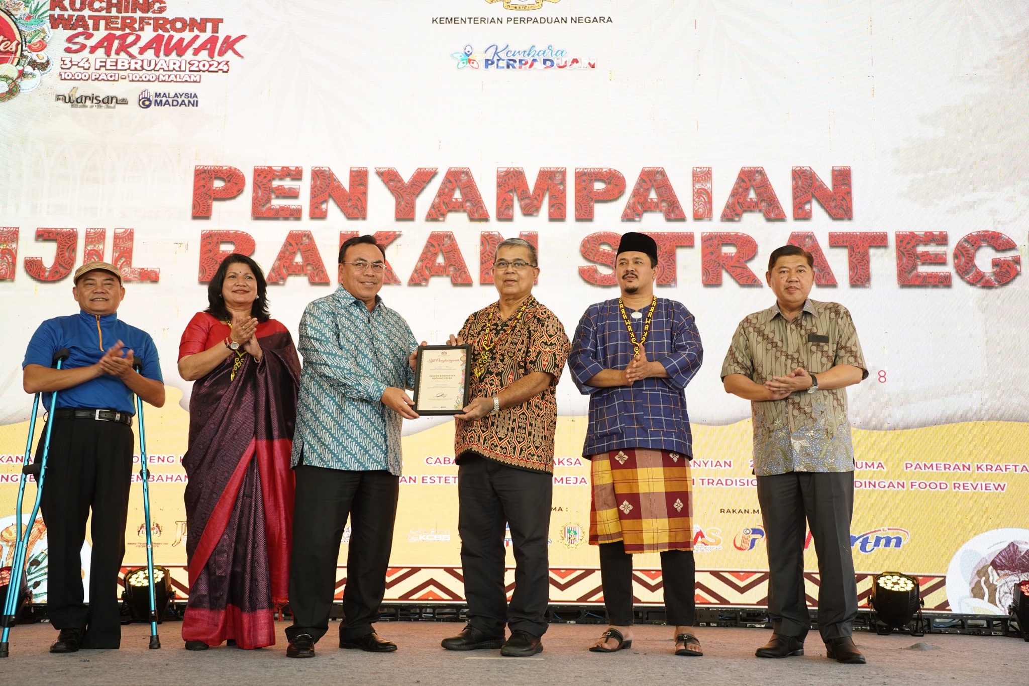 Turut hadir, YB Senator Puan Saraswathi Kandasami Timbalan Menteri Perpaduan Negara, YBhg. Tuan Haji Hilmy bin Haji Othman, Datuk Bandar, Dewan Bandaraya Kuching Utara, YBrs. Tuan Mohamad Sobri bin Mat Daud, Timbalan Ketua Setiausaha, Kementerian Perpaduan Negara, YBhg. Dato Zaiedi Haji Suhaili, Timbalan Datuk Bandar, Majlis Bandaraya Kuching Selatan dan YBrs. Tuan Haji Dirwana bin Haji Azool, Pengarah Negeri Jabatan Perpaduan Negara dan Integrasi Nasional.
