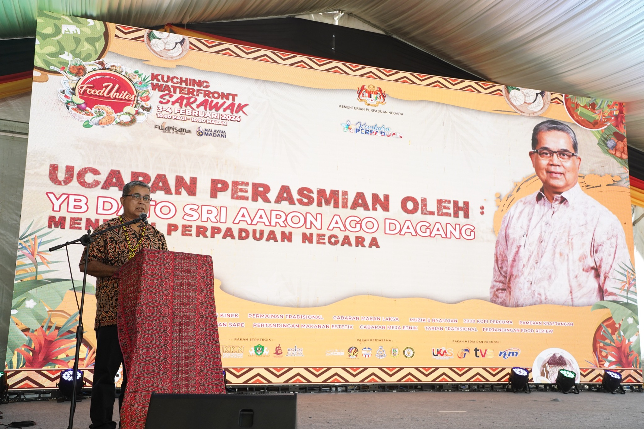 03 Februari 2024, Sarawak – YB Dato Sri Aaron Ago Dagang, Menteri Perpaduan Negara telah merasmikan Program FoodUnites Ini Warisan Kita bertempat di Kuching Waterfront, Sarawak.