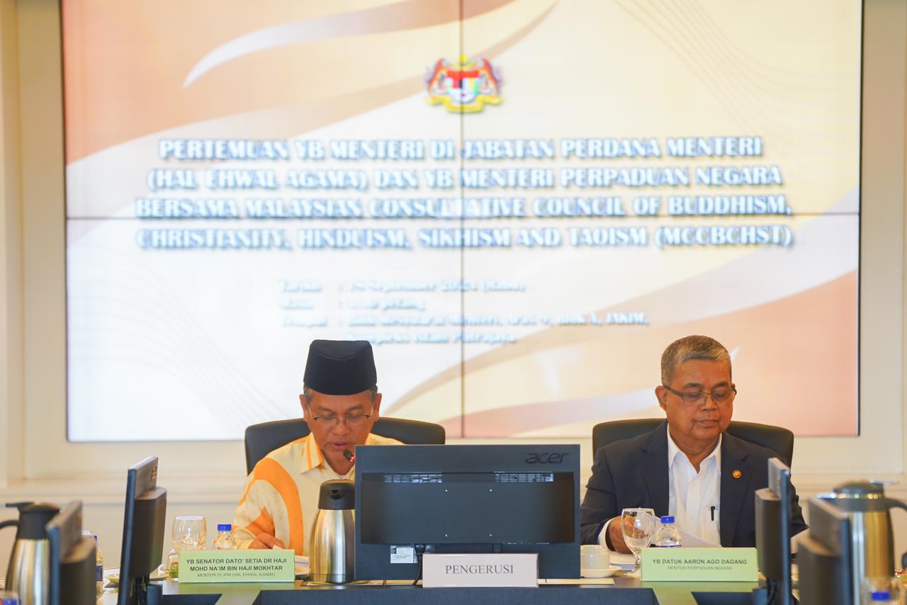 18 September 2024, Putrajaya - YB Datuk Aaron Ago Dagang, Menteri Perpaduan Negara bersama YB Senator Dato’ Setia Dr. Haji Mohd Na’im Bin Haji Mokhtar, Menteri di Jabatan Perdana Menteri (Hal Ehwal Agama) telah bertemu dengan Majlis Perundingan Malaysia bagi Buddha, Kristian, Hindu, Sikh dan Taoisme (MCCBCHST) pada hari ini.