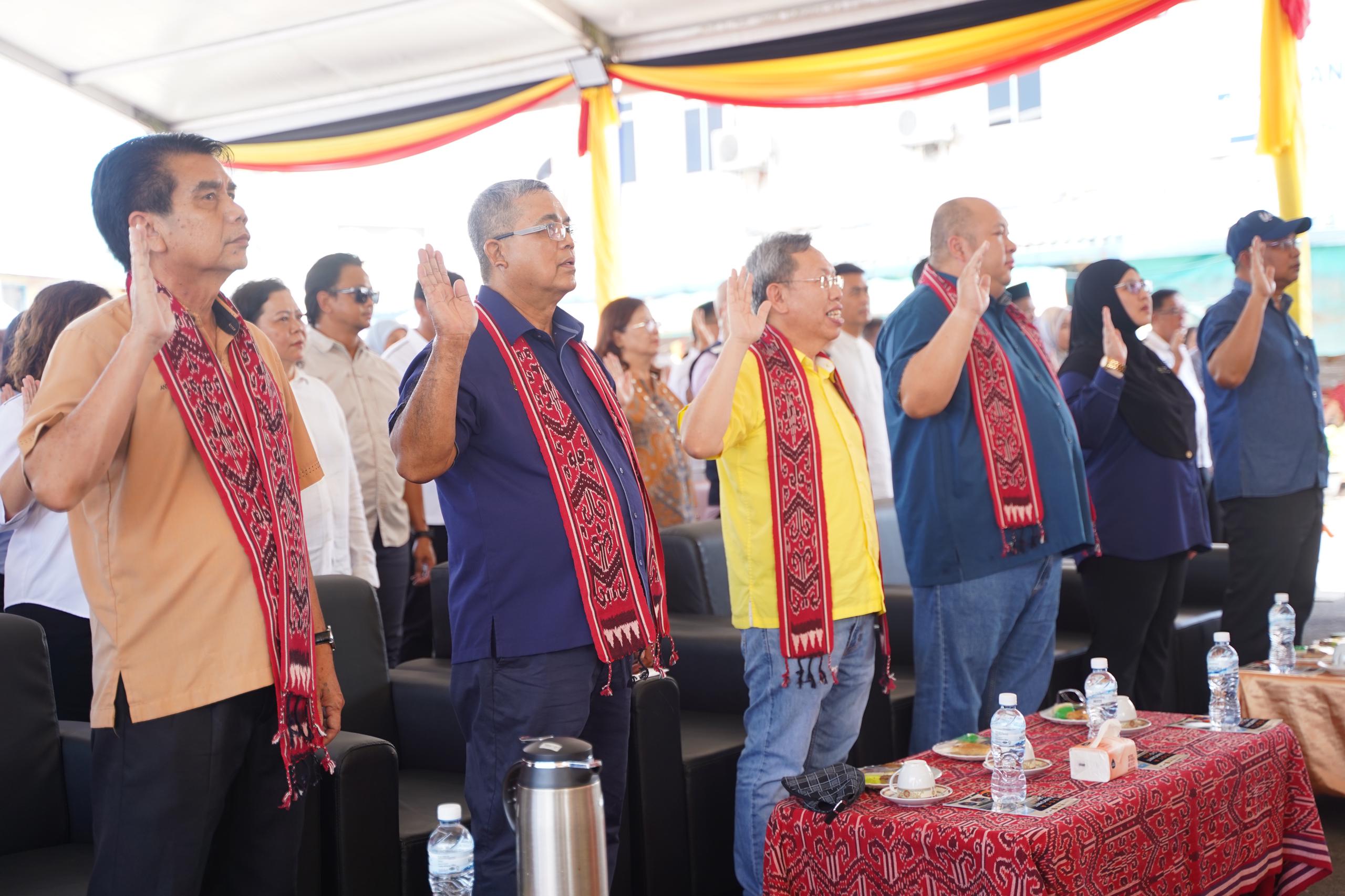 Turut hadir, YB Dato Sri Aaron Ago Dagang, Menteri Perpaduan Negara, YBrs. Puan Norihan binti Mohamed Naim, Setiausaha Bahagian Kanan (Pengurusan), KPN dan YBhg. Dato’ Haji Che Roslan bin Che Daud, Ketua Pengarah Jabatan Perpaduan Negara dan Integrasi Nasional (JPNIN).