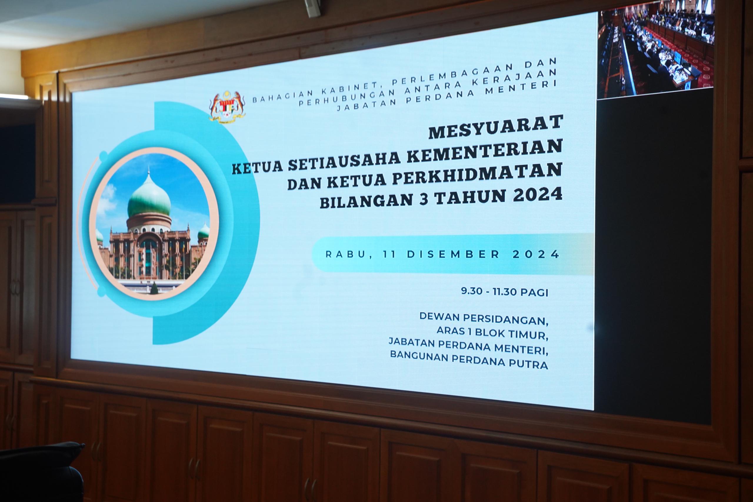 11 Disember 2024, Putrajaya - YBhg. Datuk Seri Hj. Hasnol Zam Zam bin Hj. Ahmad, Ketua Setiausaha Kementerian Perpaduan Negara telah hadir ke Mesyuarat Ketua Setiausaha Kementerian dan Ketua Perkhidmatan Bilangan 3 Tahun 2024 bertempat di Dewan Persidangan Aras 1 Blok Timur Jabatan Perdana Menteri yang telah dipengerusikan oleh YBhg. Tan Sri Shamsul Azri bin Abu Bakar, Ketua Setiausaha Negara.