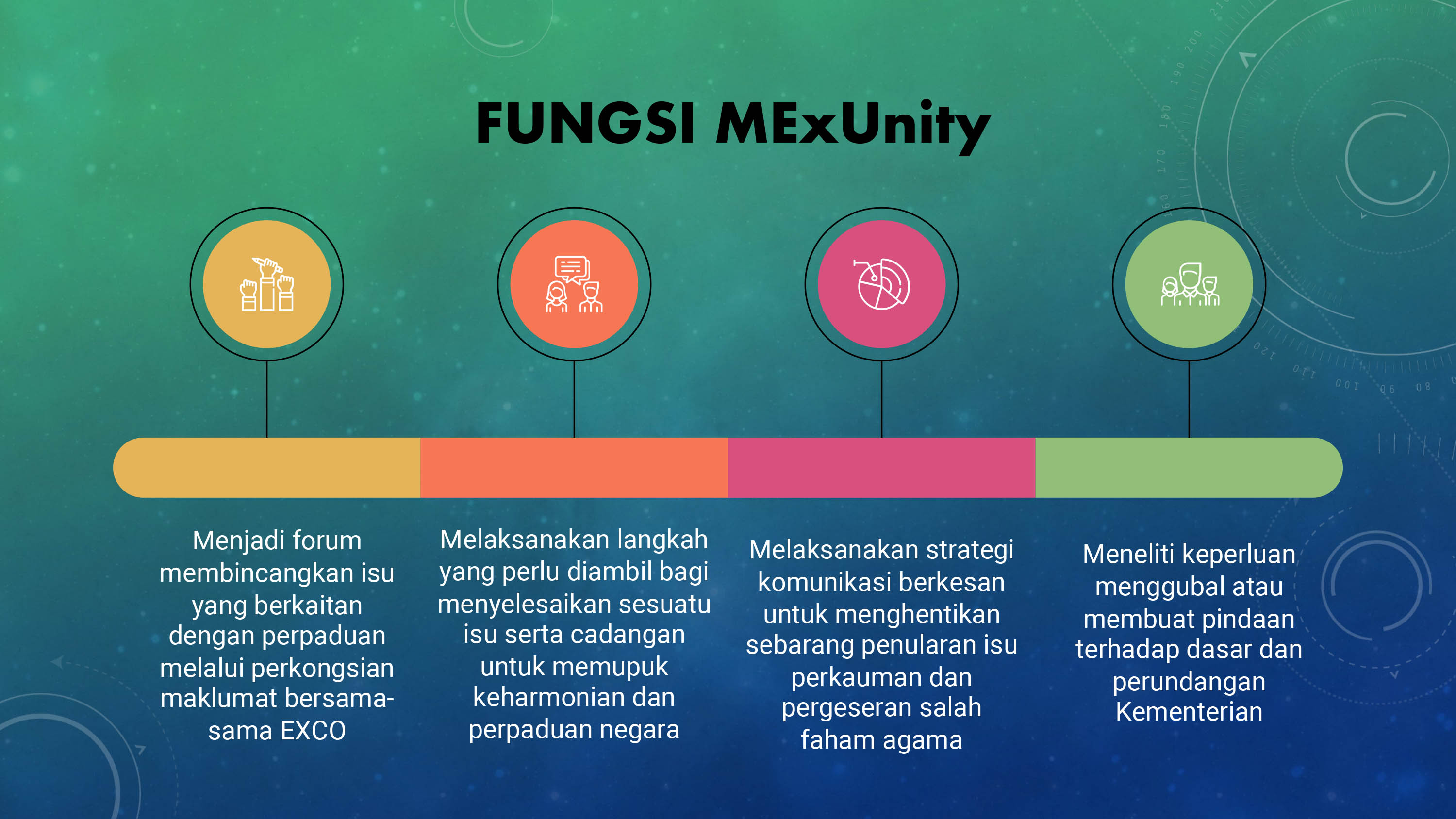 - Menjadi forum untuk membincangkan isu dan masalah yang berkaitan dengan perpaduan termasuk suasana perpaduan dan hal integrasi nasional melalui perkongsian maklumat bersama Ahli-Ahli Majlis Mesyuarat Kerajaan Negeri (EXCO) Perpaduan Negeri dan EXCO Hal-Ehwal Agama Selain Islam;