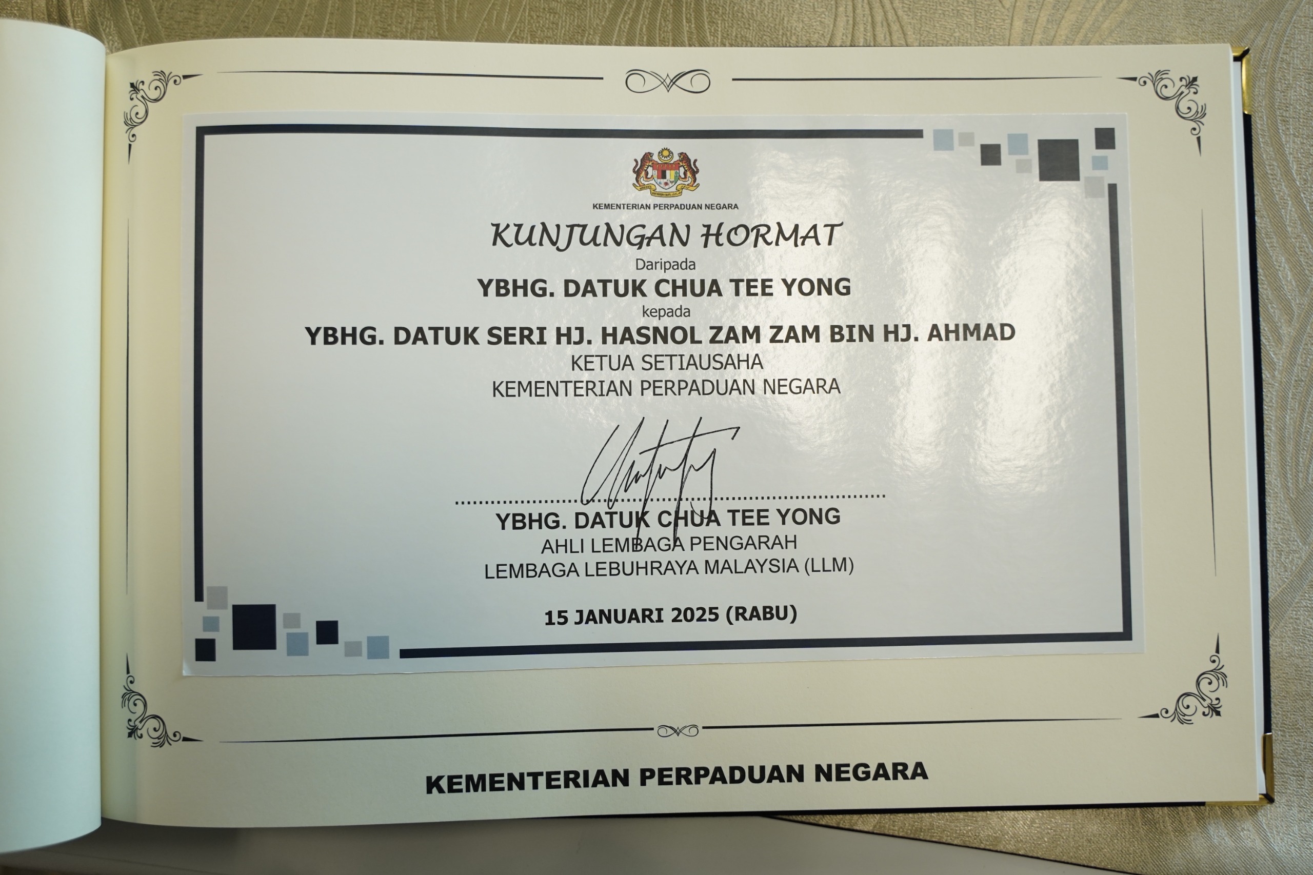 15 Januari 2025, Putrajaya - Sesi Kunjungan Hormat daripada YBhg. Datuk Chua Tee Yong, Ahli Lembaga Pengarah Lembaga Lebuhraya Malaysia (LLM) kepada YBhg. Datuk Seri Hj Hasnol Zam Zam bin Hj. Ahmad, Ketua Setiausaha Kementerian Perpaduan Negara.