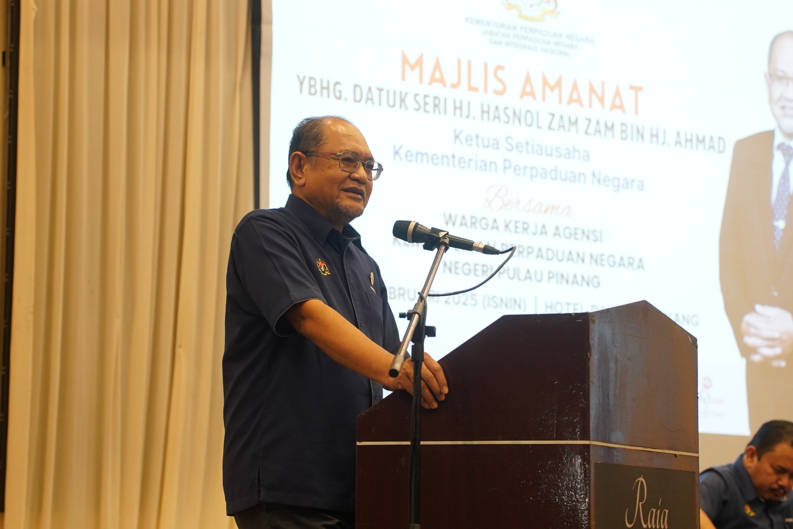 24 Februari 2025, Pulau Pinang - YBhg. Datuk Seri Hj. Hasnol Zam Zam bin Hj. Ahmad, Ketua Setiausaha Kementerian Perpaduan Negara telah hadir menyampaikan amanat kepada Warga Kerja Agensi Kementerian Perpaduan Negara Negeri Pulau Pinang di Hotel RAIA Inn, Pulau Pinang.