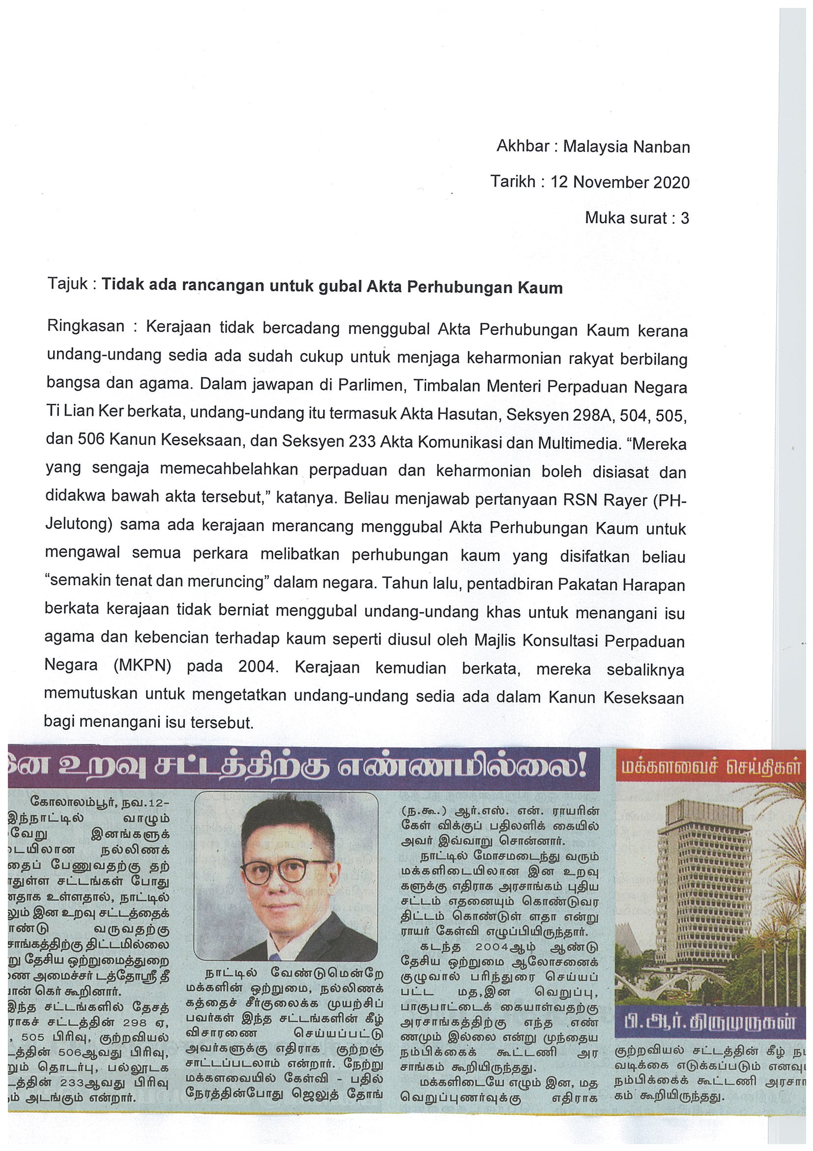[12-11-2020] - Berita Harian Akta Hubungan kaum tak digubal