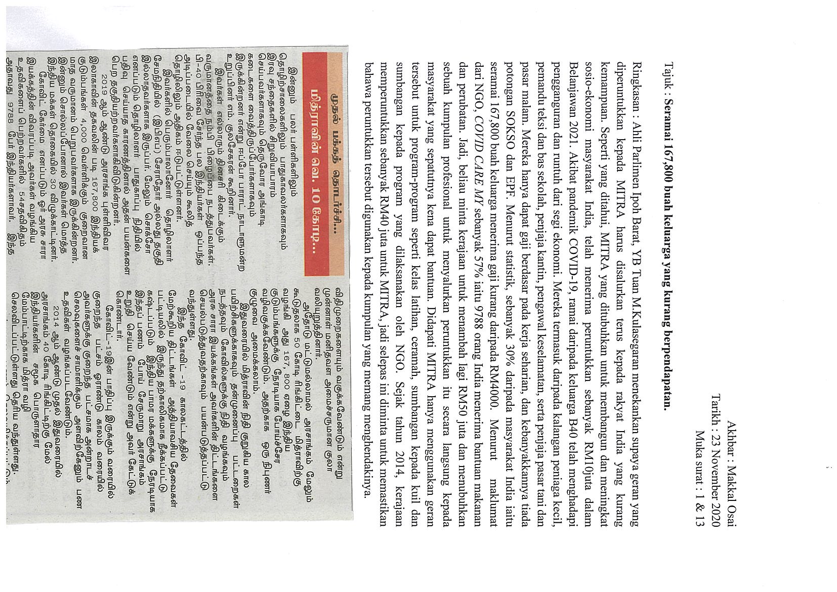 [24-11-2020] - Makkal Osai Biar peruntukkan untuk MITRA membantu masyarakat B40