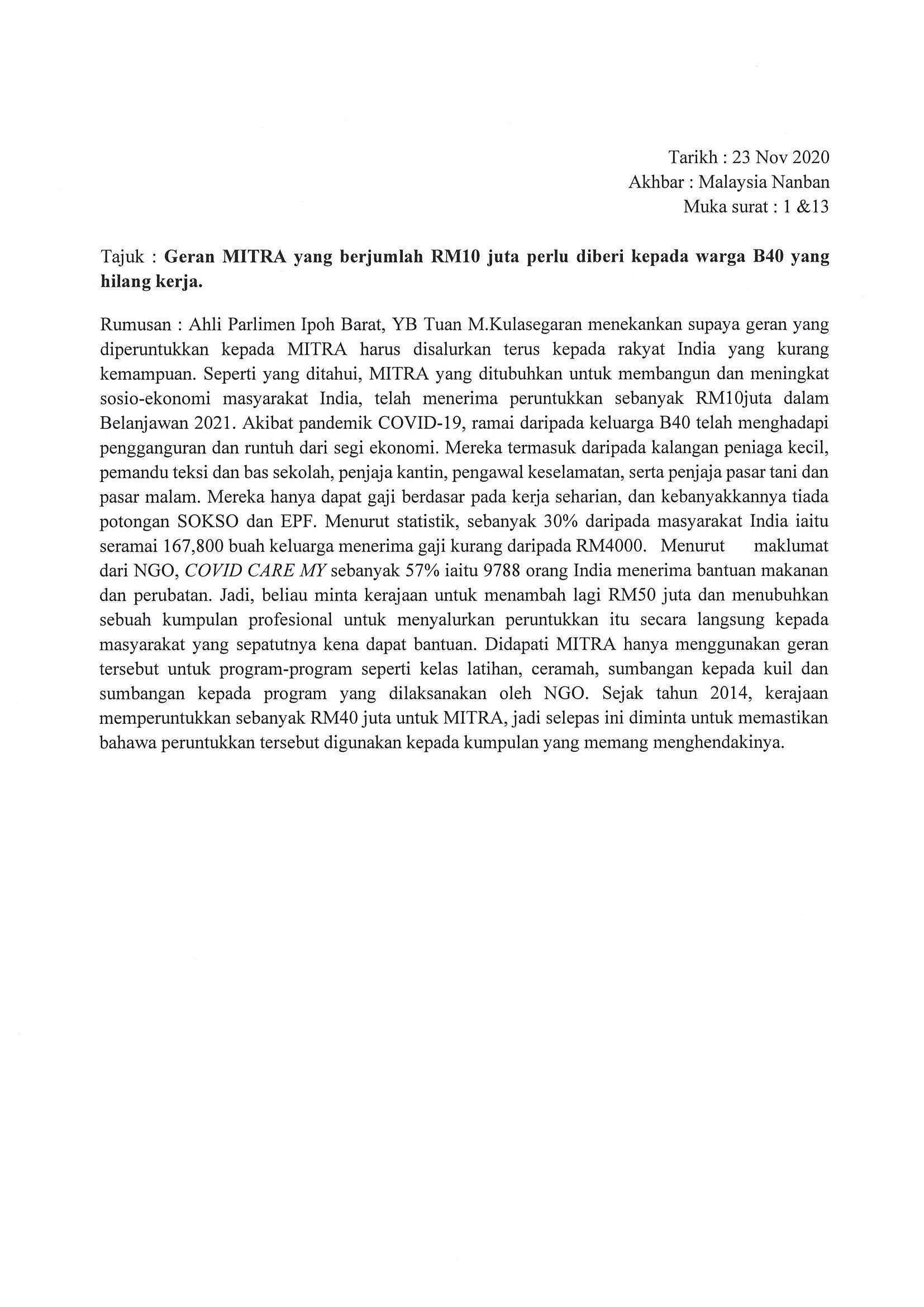 [23-11-2020] - Malaysia Nanban Geran MITRA yang berjumlah RM10 juta perlu diberi kepada warga B40 yang hilang kerja