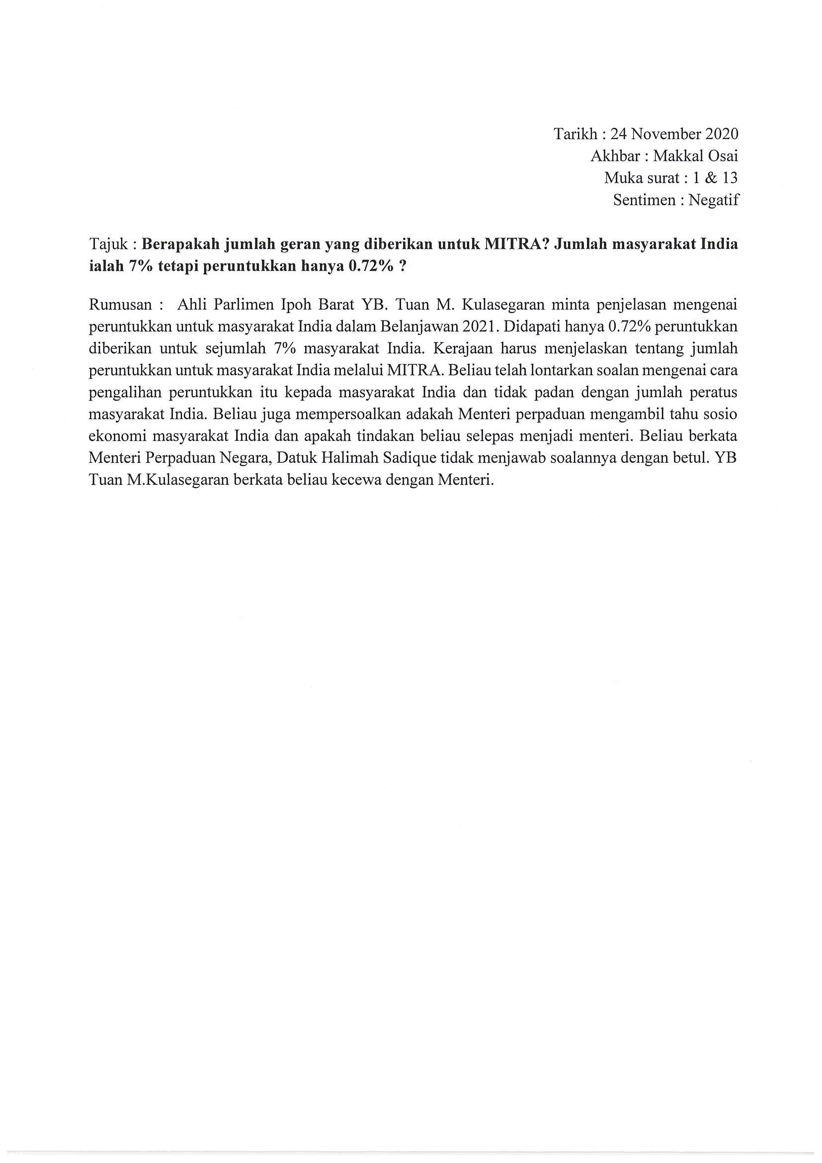 [24-11-2020] - Makkal Osai Berapakah jumlah geran yang diberikan untuk MITRA? Jumlah masyarakat India ialah 7% tetapi peruntukkan hanya 0.72%?