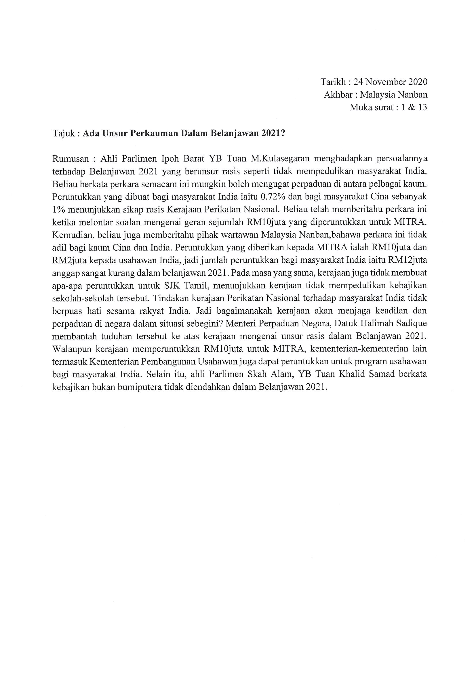 [24-11-2020] - Malaysia Nanban Ada Unsur Perkauman Dalam Belanjawan 2021