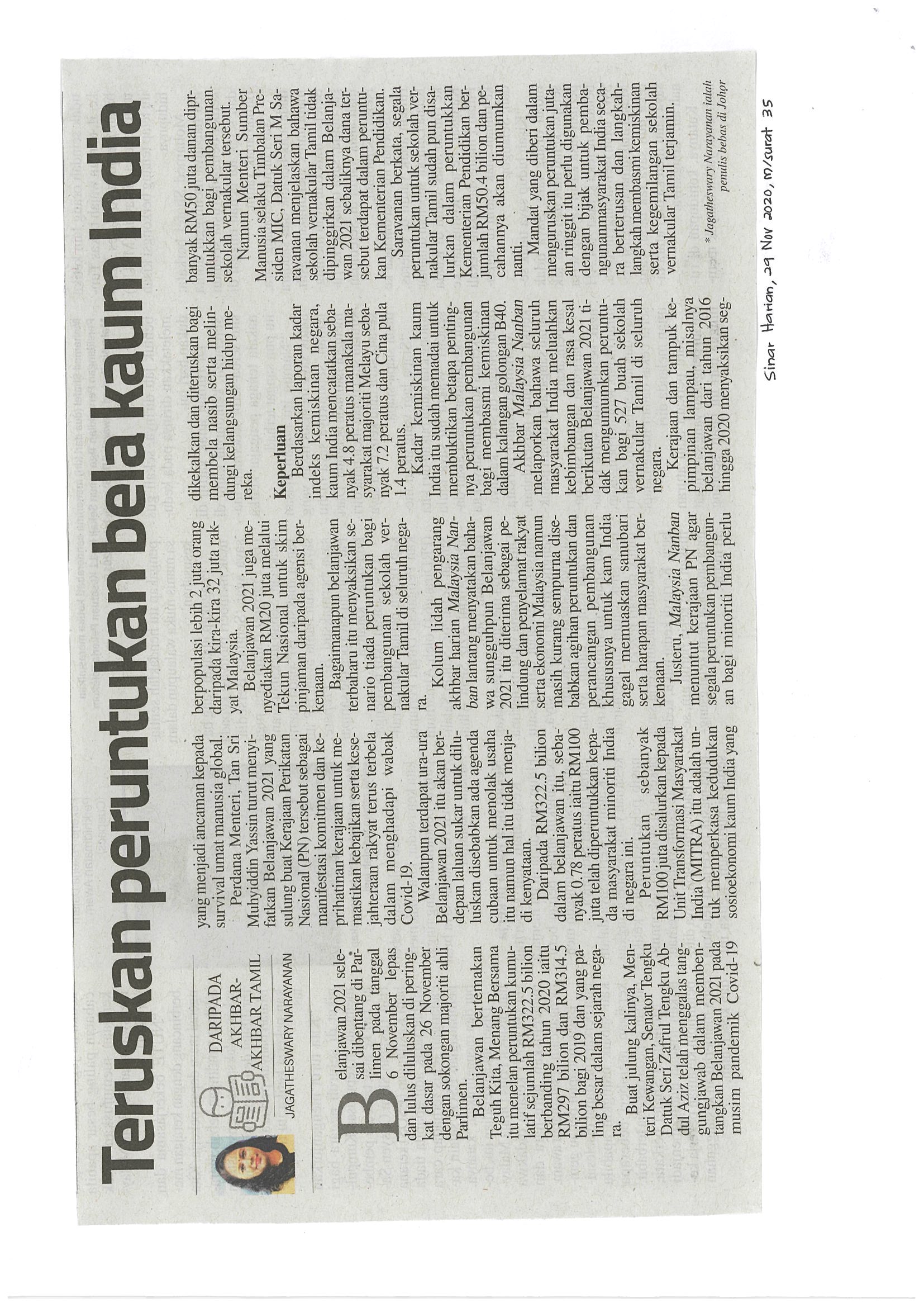 [29-11-2020] - Sinar Harian Teruskan peruntukan bela kaum India
