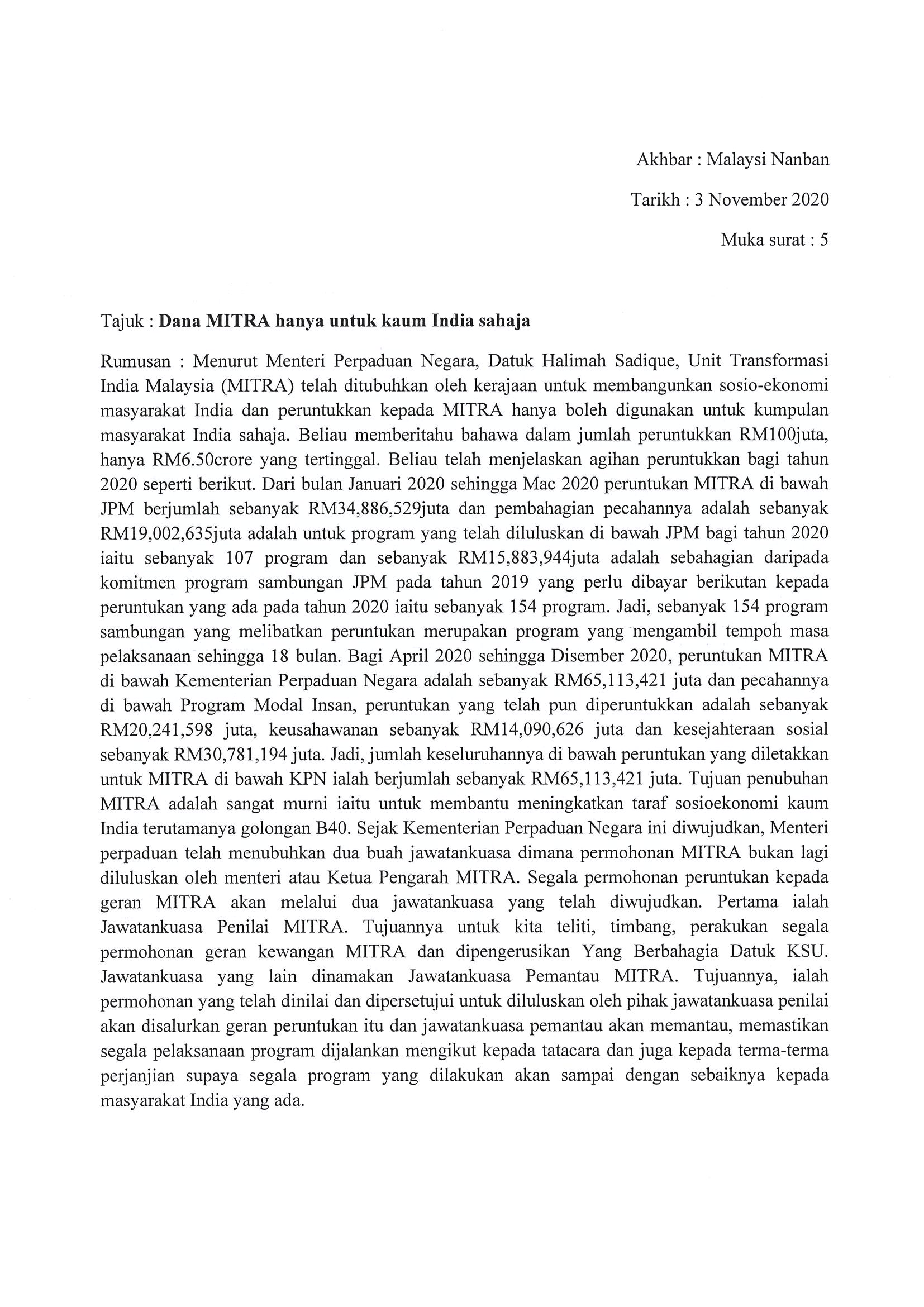 [03-11-2020] - Malaysia Nanban Dana MITRA hanya untuk kaum India sahaja