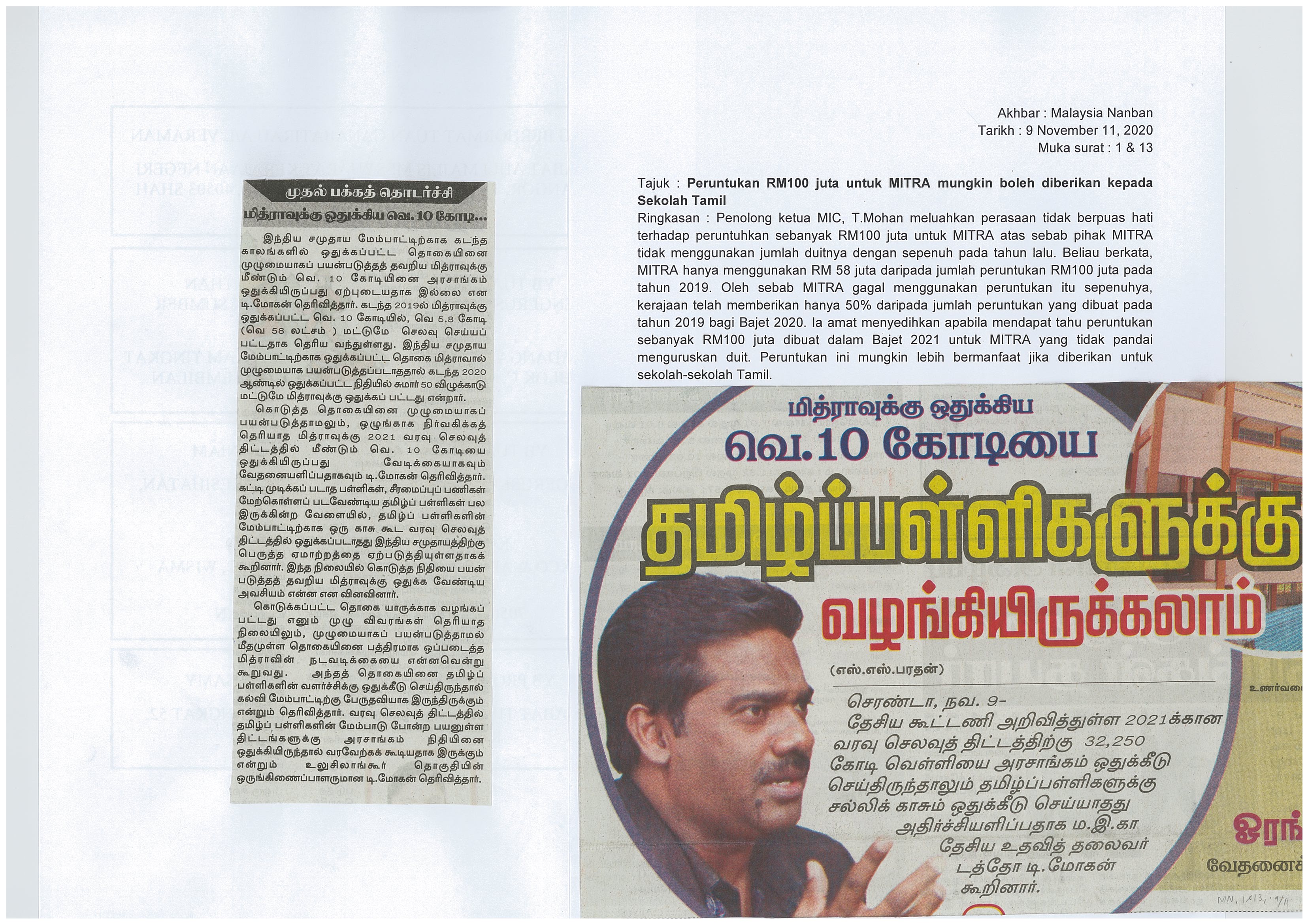 [09-11-2020] - Malaysia Nanban Peruntukan RM100 juta untuk MITRA mungkin boleh diberikan kepada Sekolah Tamil