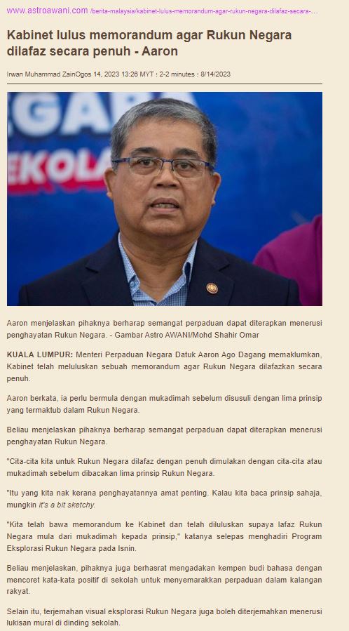 Astro Awani - Kabinet lulus memorandum agar Rukun Negara dilafaz secara penuh - Aaron