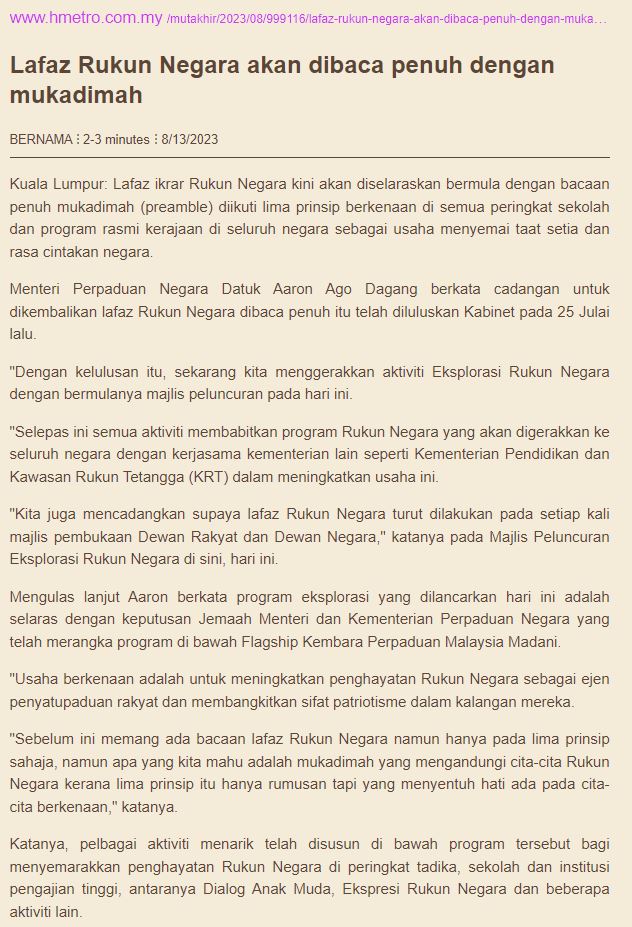 Harian Metro - Lafaz Rukun Negara akan dibaca penuh dengan mukadimah