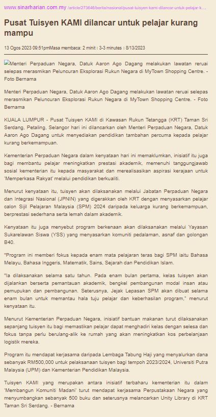 Pusat Tuisyen KAMI dilancar untuk pelajar kurang mampu