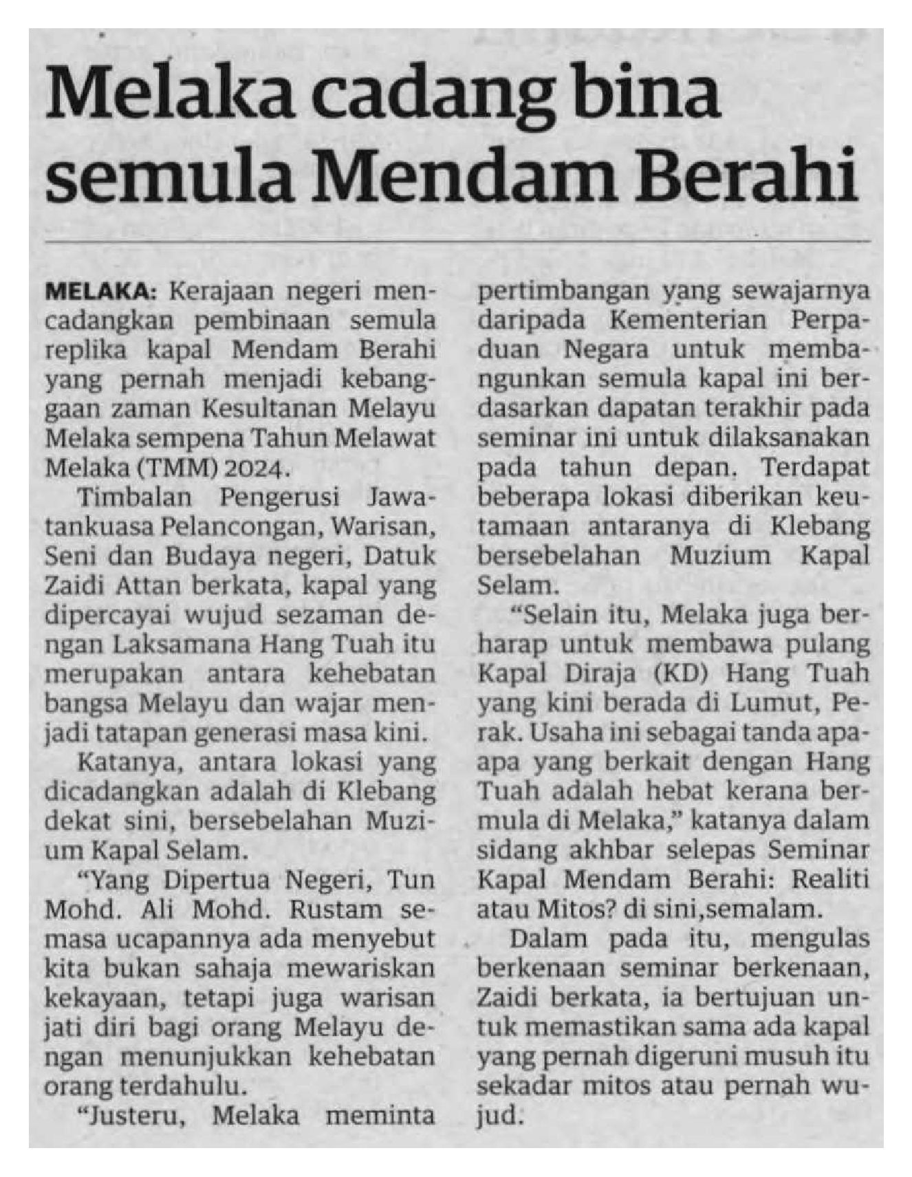 Melaka cadang bina semula kapal Mendam Berahi